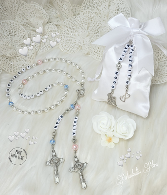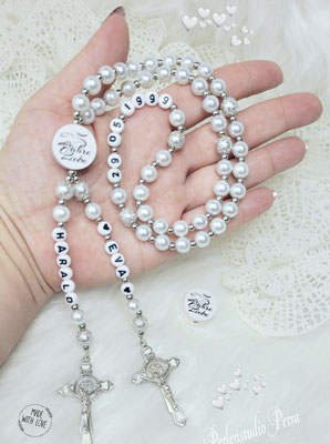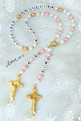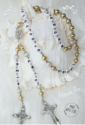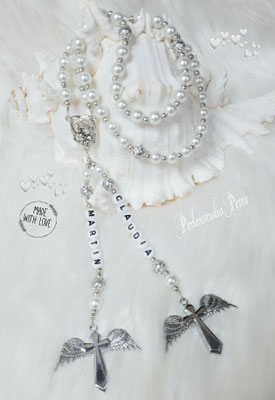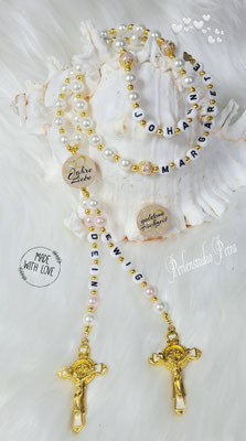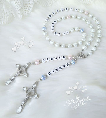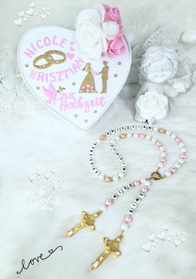 Ein Hochzeits Rosenkranz ist ein zauberhaftes, persönliches Geschenk. Gerne gestalte ich dir den Rosenkranz fürs Brautpaar individuell mit Wunschnamen und Hochzeitsdatum. Meine süssen Hochzeits Rosenkränze sind als Zier-und Dekoration und nicht für den täglichen Gebrauch gedacht.